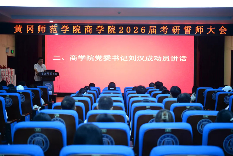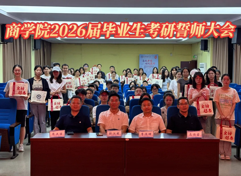 青春为笔书壮志,誓师为帆启新程。为凝聚考研学子奋进力量,提振备考信心,9月18日晚上19:00,商学院在致远楼三楼会议室举办2026届毕业生考研誓师大会。院党委书记刘汉成,院党委副书记李传坤,副院长周业旺、马迎霜,全体辅导员、毕业班班主任及备考研学生齐聚一堂。