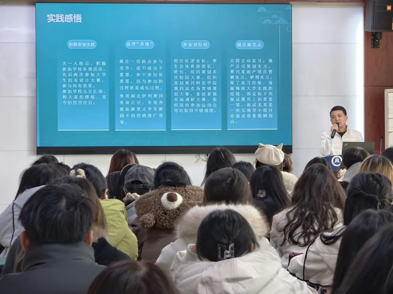 碧桂园服务湖北区域运维总监、2011届国际经济与贸易专业毕业生洪乐则带来《从校园到职场的修炼秘籍》的精彩报告,他以自身从管培生到区域总监的成长路径为例,向学生拆解“职场新人的角色转换、沟通逻辑与抗压能力培养”,其“先做‘执行者’再做‘思考者’”的观点引发学子共鸣。