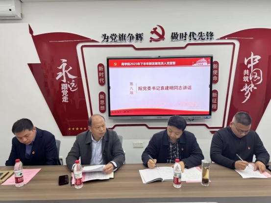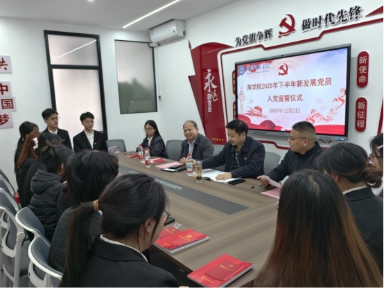 12月2日下午4点,商学院2025年下半年新发展党员入党宣誓仪式在兰四103党员活动室庄重举行。院党委书记袁建明,院党委副书记李传坤,学生党支部书记桂海钦、罗舒成,正式党员代表张从欢,入党积极分子代表罗恒泉、刘晟男,以及10名新发展党员参加此次仪式。仪式由罗舒成主持。