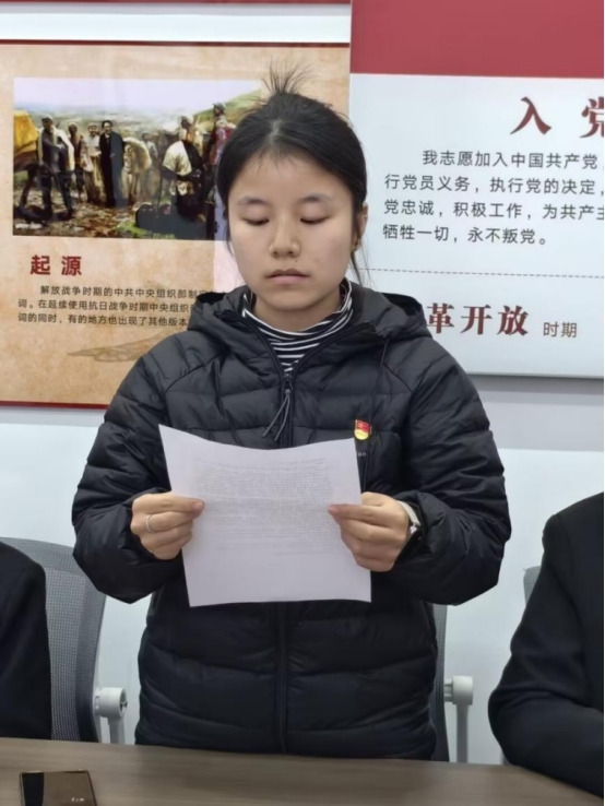新发展党员代表程文慧同志代表全体新发展党员向党组织一直以来的的关怀与培养表示感谢。她表示,站在新的起点,面对党旗许下铮铮誓言,这不仅是一份使命的传承,更是一份沉甸甸的责任,作为新发展党员,定当珍惜这份政治荣誉,恪守入党誓言,将今天的激动与自豪,转化为在未来学习、工作和生活中的奋斗动力,以实际行动发挥党员先锋模范作用,努力践行对党的忠诚,为党的事业贡献青春力量。