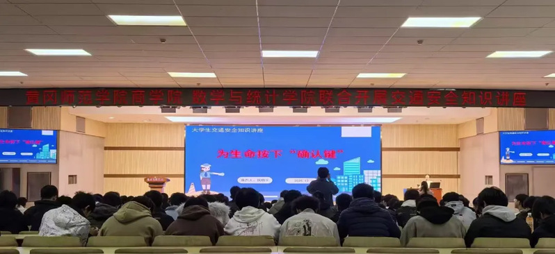 为拧紧学生的“安全弦”,筑牢交通安全防线,12月11日下午商学院和数学与统计学院在北区报告厅联合开展安全知识讲座,商学院党委书记袁建明、副书记李传坤、辅导员侯晓文、桂海钦,数统学院党委书记黄小花、副书记宋明、辅导员余杨昕出席会议。
